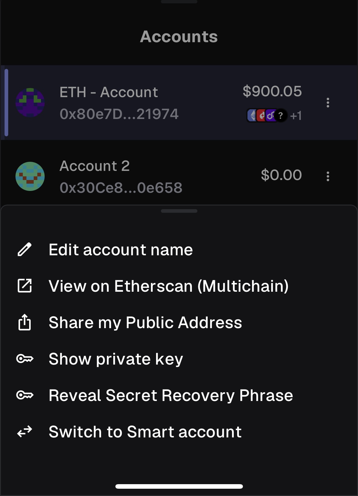 Purpose: I have too many accounts on my wallet, one is imported from my father and brother we started in the beginning with, and one is created on accident, while importing the first account.. So I have 2 accounts I don‘t really need, and want to remove, so I can work on my 2 networks I use.